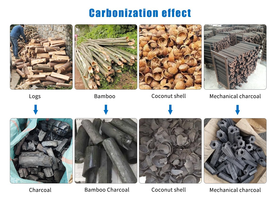 Almost all the biomass can be made into charcoal, such as peanut shell, coconut shell, wood, biomass, some crops, bamboo, waste wood, branches, trunks, logs, bark, stumps, roots, wooden pallet, sawdust, shavings, wood chips, fruit wood, rice husk, corncob, peanut shell, furfural residue, palm shell, semi-coke and etc.